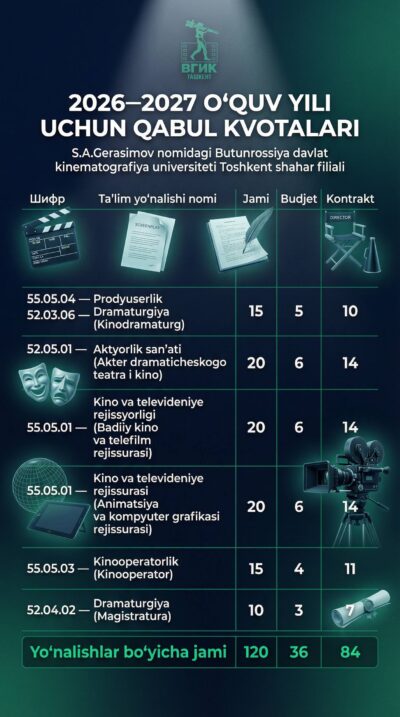 S.A. Gerasimov nomidagi Butunrossiya davlat kinematografiya universiteti Toshkent filialida yangi o‘quv yili uchun qabul kvotalari e’lon qilindi!
